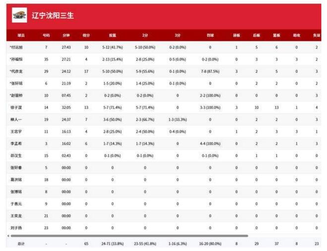 至辽宁队为何会输如此多分,原因也是十分简单,没错,那就是球员的水平不行,看看辽宁队球员的投篮,全场比赛,71投只命中了24球,命中率只有三成多一点。三分球更加是惨不忍睹,16投仅1中,命中率为6.3%,这样的水平,可以说,和菜市场的大妈投篮水平,也是差不了多少。